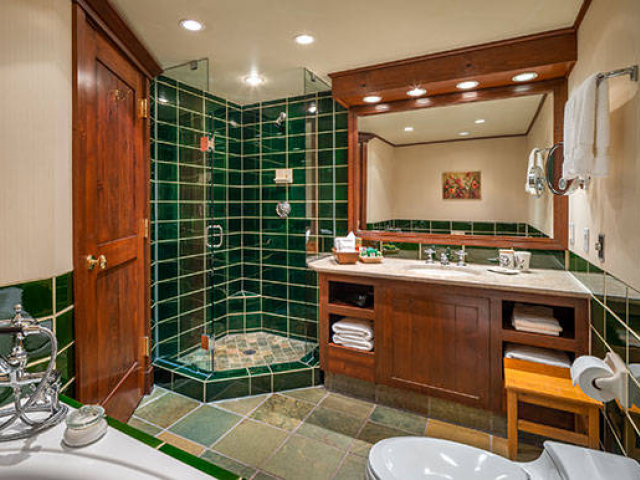 This suite is located on the third floor of the hotel and offers one king bed in a separate bedroom. Additional features include a fireplace, a living room, a wet bar, a balcony, and two bathrooms, one with a whirlpool tub and the other with a walk-in shower. The mountainside faces west, with possible mountain views, and overlooks the hotel guest parking area, some train noise will be heard.