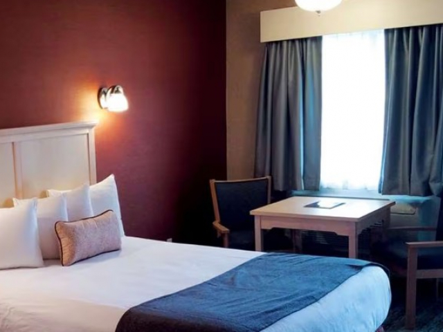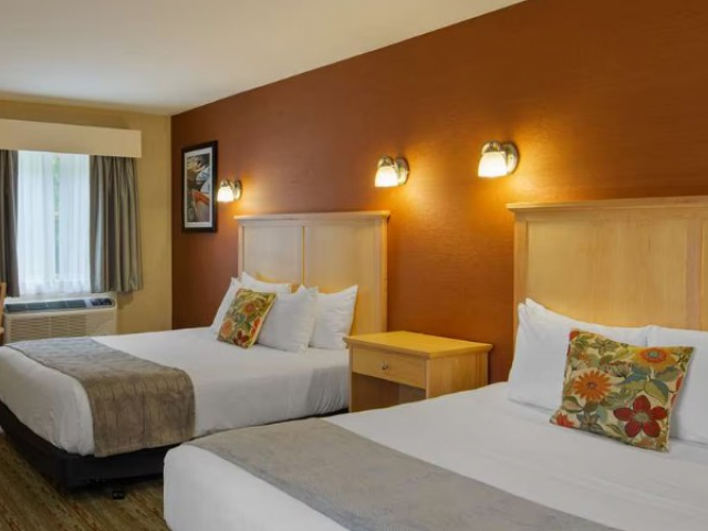 The 2 Queen room sleeps up to four people. The room features a flat-screen TV, free wireless internet, air conditioning, a mini-fridge, and a microwave. A full complimentary breakfast is offered to all guests.
