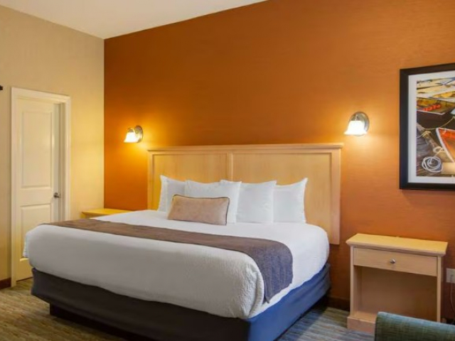 The 1 King Bed Deluxe Amenities room sleeps up to two people. This spacious room features a flat-screen TV, free wireless internet, air conditioning, a mini-fridge, and a microwave. A full complimentary breakfast is offered to all guests.