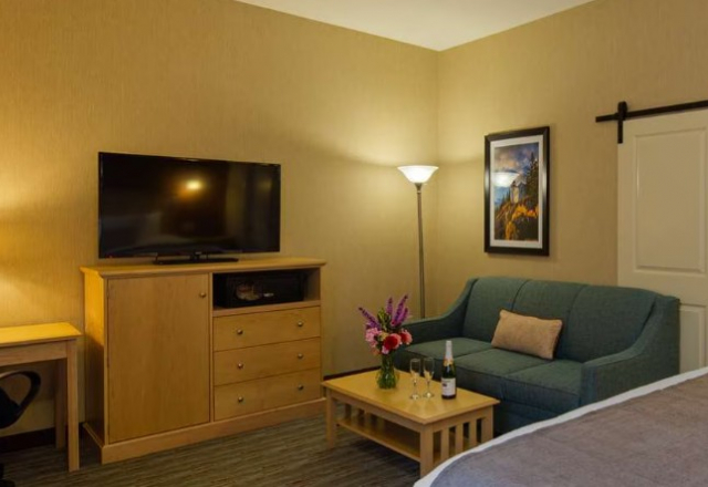 The Suite 1 King Bed sleeps up to two people. This spacious room features a sitting area with a sofa, flat-screen TV, free wireless internet, air conditioning, a mini-fridge, and a microwave. A full complimentary breakfast is offered to all guests.