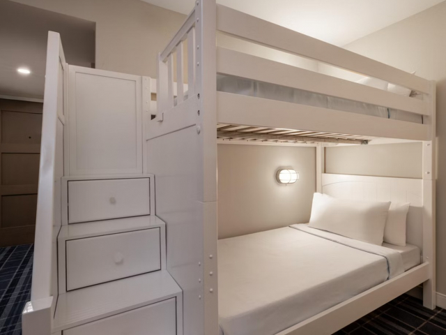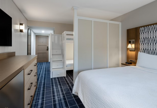 The 1 King 1 Bunk Bed One Bedroom Suite sleeps a maximum of four people. In addition to a separate bedroom, the suite includes a kids' area, a flat-screen television, free Wi-Fi, and a mini-refrigerator. The suite includes a balcony to take in the surroundings. Please note that this suite does not have ocean views.