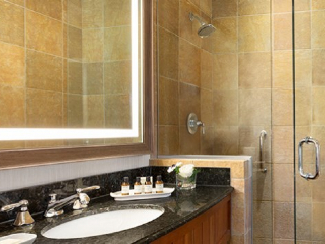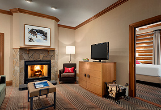 This spacious suite offers a separate bedroom with one king bed and a sitting area with a sofa sleeper. It boasts two full bathrooms and a private balcony offering amazing views of Lac Beauvert while being conveniently located close to the spa and other main lodge amenities.