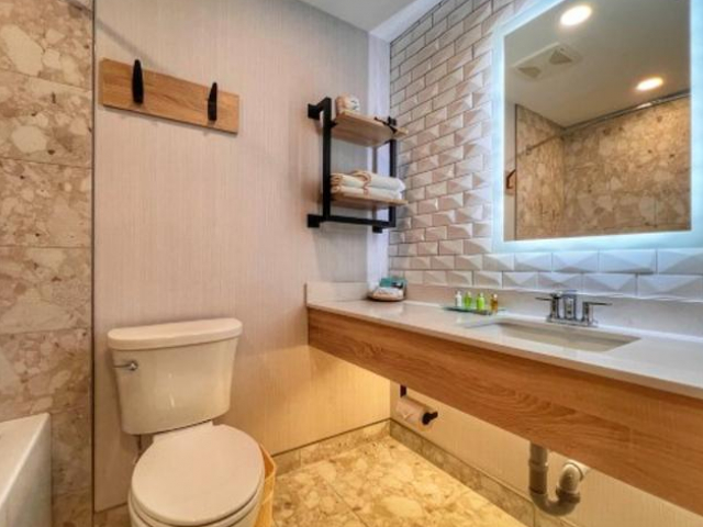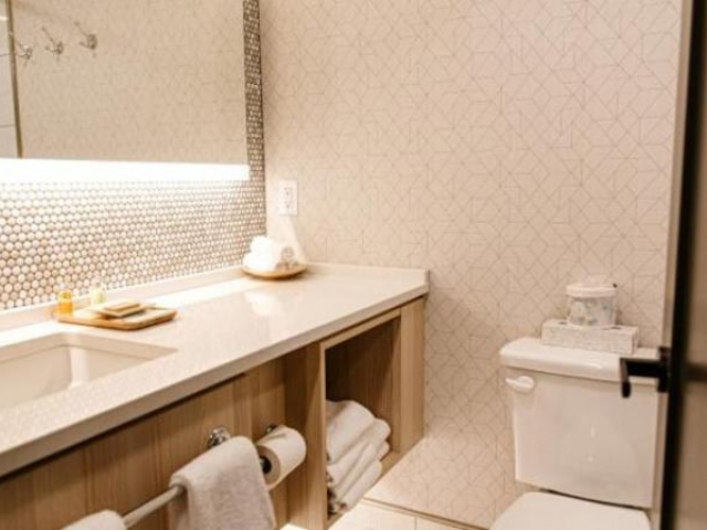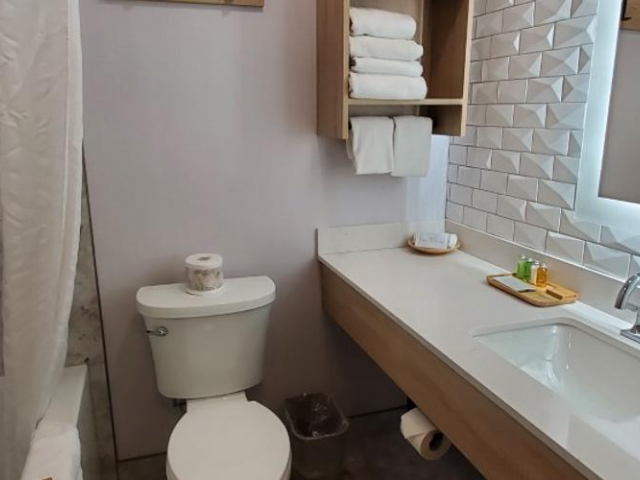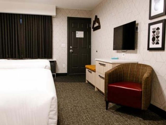 The King Explorer Suite is a very spacious suite with one queen bed, twin over twin bunk bed, and a pull-out sofa bed sleeping a maximum of six people. It is located in the Timber Building on the second floor. Second-floor rooms do not have elevator access. The suite consists of a cozy and roomy sitting area with a pull-out sofa bed and electric fireplace. The suite is also equipped with a flat-screen television with satellite, wireless internet, sofa bed, microwave, mini-refrigerator, tea & coffee maker, and iron & ironing board. The suite boasts modern furnishings.