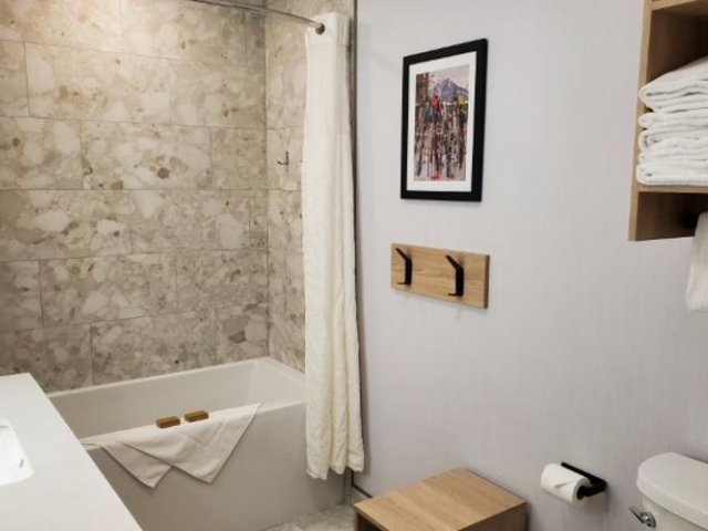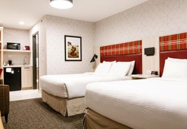 The Mountaineer One Bedroom Suite is a spacious new suite with two queen beds and a pull-out sofa bed sleeping a maximum of six people. It is located in the Timber Building on the second floor. Second-floor rooms do not have elevator access. The suite consists of a separate sitting area with a pull-out sofa bed and electric fireplace. The suite is also equipped with a flat-screen television with satellite, wireless internet, sofa bed, microwave, mini-refrigerator, tea & coffee maker, and iron & ironing board.