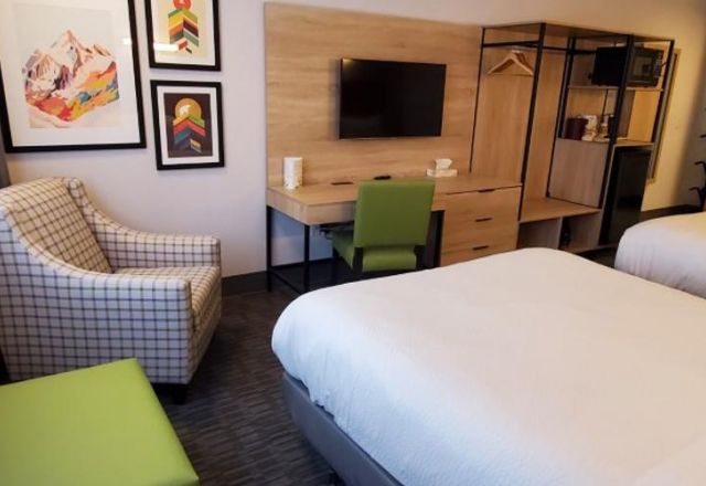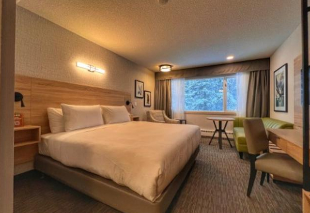 The guest rooms and suites of the Mountaineer Lodge are situated in two buildings on the property surrounded by pine forests and views of the Rocky Mountains. The two buildings are the Main Lodge and the Timber Building. Guest rooms can sleep a maximum of two to four people. Family Rooms and multi-bedroom suites can sleep up to six people. All rooms and suites include flat-screen televisions, wireless internet, microwaves, and mini-fridges. For extra space, suites have a separate sitting area with a sofa bed and electric fireplace. Both the Main Lodge and Timber Building have two floors. There is no elevator access to the second floor. Air conditioning is available in select rooms. All rooms and suites have new pillow-top mattresses and duvet bedding.