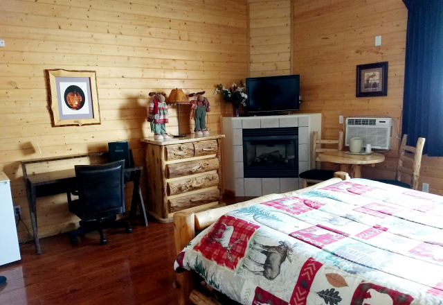 These rooms offer one king bed. Rooms are furnished with hand-made log furniture and a fireplace, and include a full private bathroom.