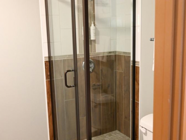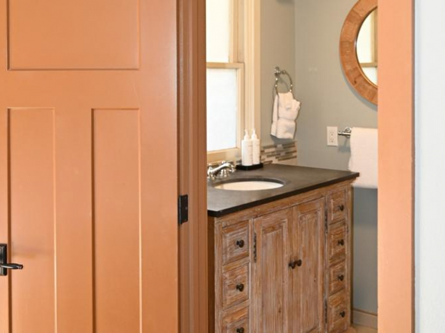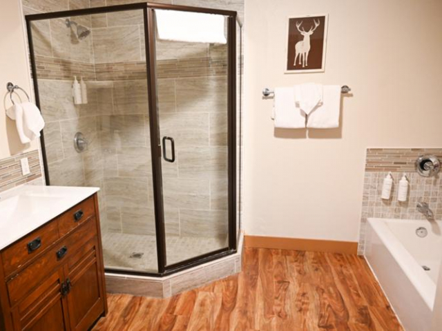 The contemporary bathroom includes a spacious walk-in shower for a refreshed experience. For added convenience, a sheltered walkway provides a brief, protected stroll directly to the lobby and the primary Ranch House facilities.