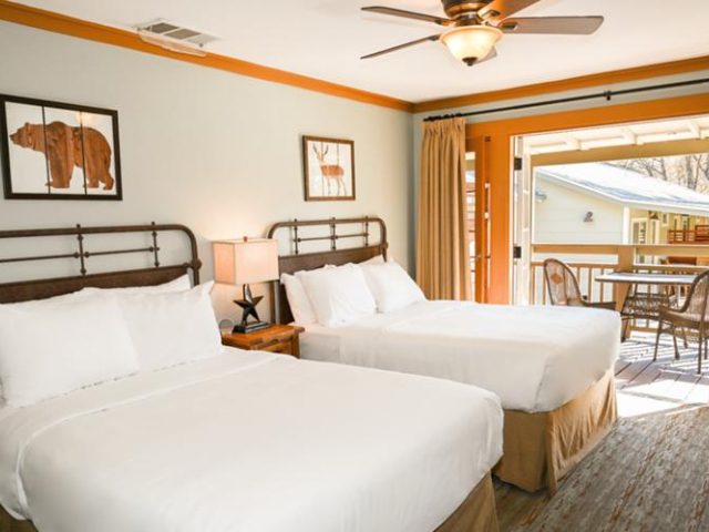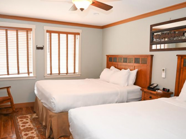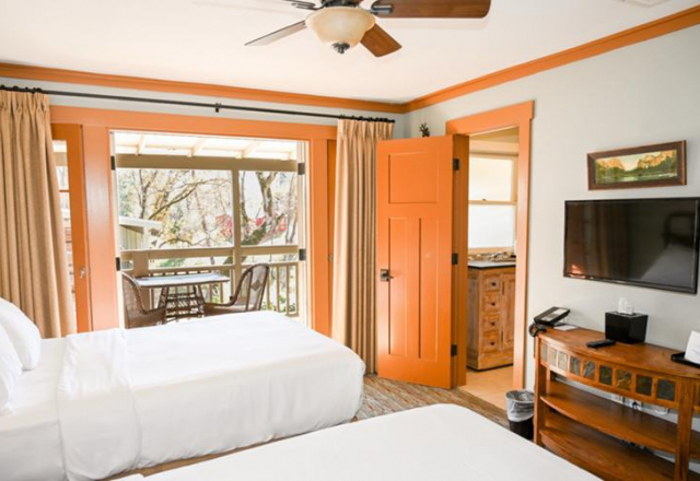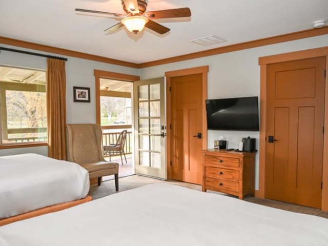 Beyond the scenery, the room is outfitted with a comprehensive array of standard amenities and a contemporary bathroom with a glass-enclosed walk-in shower. For effortless access to the heart of the property, a sheltered walkway leads you directly to the lobby and the main Ranch House in just a few moments.