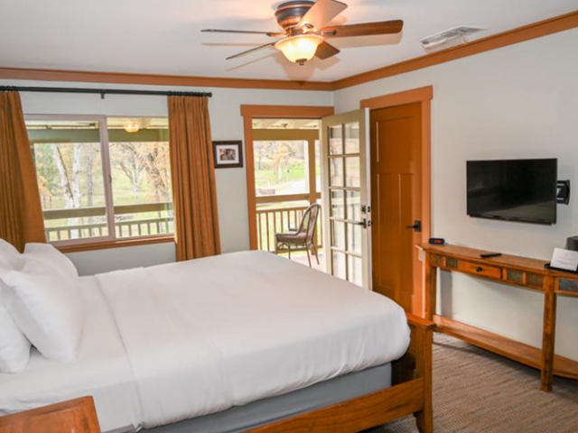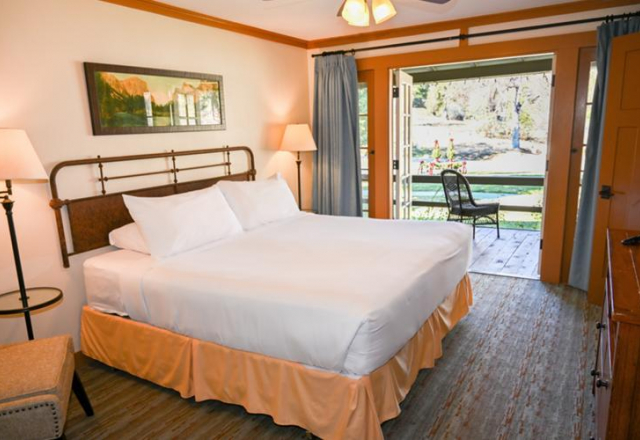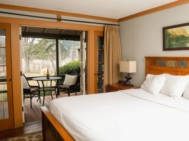 Situated directly inside the primary Ranch House, this guest room captures a unique blend of frontier heritage and modern-day luxury. The space is anchored by a deluxe king bed and offers unrivaled access to the lobby and central lodge. For those seeking fresh air, French doors transition seamlessly to a private, furnished veranda—an ideal setting for admiring the property views and the cool Sierra climate.