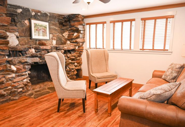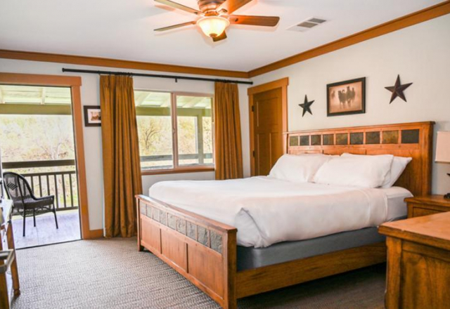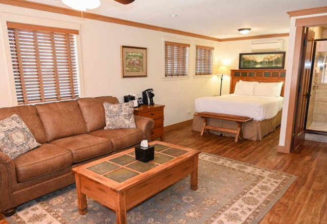 Directly connected to the primary Ranch House, this 335-square-foot suite offers a spacious layout for up to four guests, with a queen bed and a versatile sofa sleeper. The interior reflects a classic frontier aesthetic through its rich pine furniture, while modern upgrades ensure a high level of comfort. Large windows offer pleasant views of the estate grounds, bringing the outdoors into the living space.