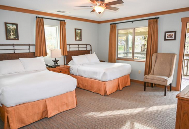 Integrated directly into the primary Ranch House, this guest room provides a versatile layout with two double beds, blending frontier-inspired aesthetics with modern refinements. For those who enjoy the outdoors, French doors transition to a personal, furnished veranda, the perfect spot to appreciate the fresh Sierra atmosphere.