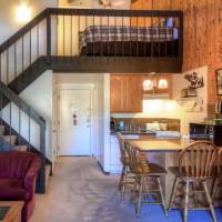 These units are open spaces with a loft (no bedrooms) that sleep a maximum of five people. All the loft condos have a small kitchen, a living room, and two bathrooms (one on each level). On the main level, there is a fully equipped kitchen with all the essentials and counter seating. The living area has a sofa sleeper, a river rock gas fireplace, and a television with a DVD player. This unit will have one queen bed, and one twin bed in the loft, and a second bathroom. There is a small deck off of the main floor with a gas BBQ grill.