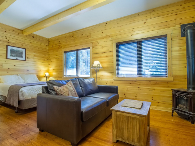 The Vermilion Cabins are modern attached suites at Kootenay Park Lodge. The cabins feature a queen bed and a double leather pull-out sofa. The bathrooms are larger than the Heritage cabins and come with a tub/shower combination and modern fixtures. The kitchenette in the Vermilion cabins offers a stainless steel fridge/freezer, microwave, coffee maker, and bar sink. There is also a gas fireplace for extra coziness. Outside the cabin, there is a porch to enjoy the mountain view. If a guest is desiring more modern amenities, then the Modern Vermilion Suite would be the ideal choice. Note: there are no televisions, cell phone service, or phone lines at Kootenay Park Lodge. There is free wireless internet at the property in the main buildings which may or may not extend to the cabins.